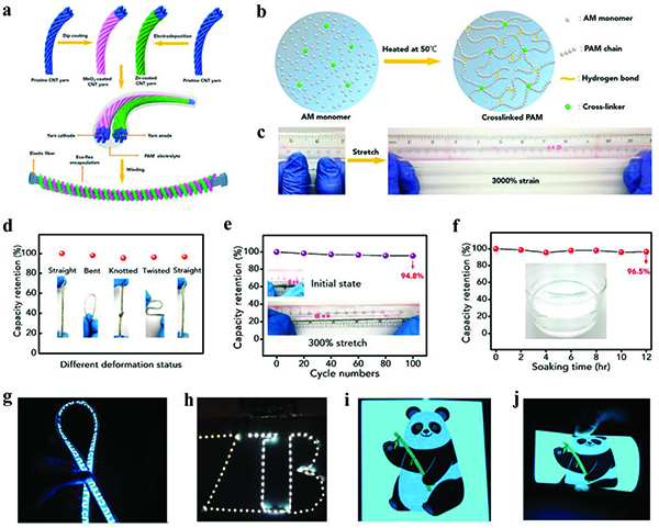 (g-j)为电致发光面板和LED带供电的纱线ZIB的照片。