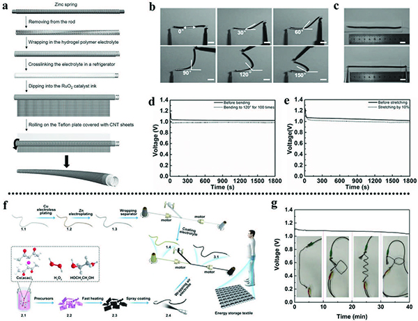 柔性和可穿戴式电子产品,如Apple智能手表,Google Glass,三星Galaxy Fold,华为Mate X,为未来生活方式呈现出突破性的技术趋势,在近些年来引起了广泛的研究关注。得益于其在机械柔韧性,高便携性和轻便性方面的特性,柔性/可穿戴式电子产品不仅改变了传统的消费电子产品,还将人造皮肤,植入式医疗设备和表皮传感器等许多新领域带入了我们的生活。由于目前的商业化的储能器件通常是刚性的,其不能满足需要便携性和柔韧性需求。因此,开发具有高柔韧性和可拉伸性的能量储存设备是十分迫切的。在各种柔性能量存储装置中,柔性电池由于其相对高的能量密度和长循环寿命而被认为是为未来的柔性/可穿戴电子设备供电的最有希望的候选者。最近,许多柔性电池已经被成功的展示,而其中大多数是以平面结构制造的,结构大,柔韧性有限,这违背了柔性/可穿戴电子设备的要求。与传统的平面结构相比,一维形状具有显着的优势,如小型化,适应性和可编织性,这使其对柔性/可穿戴电子产品更具吸引力。