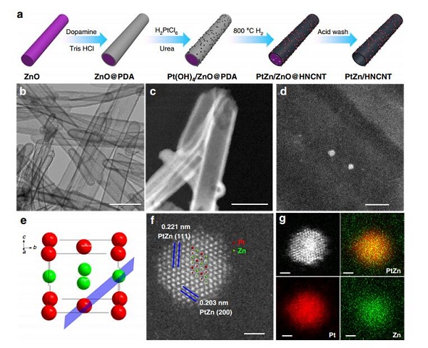 f, g.PtZn金属间化合物纳米颗粒的AC HAADF STEM图像(f) 和元素分布图像(g)