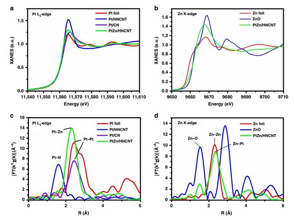 a, c.PtZn/HNCNT、Pt/HNCNT、Pt/CN和Pt片的Pt L3-edge的X射线吸收近边结构(XANES) 谱图(a)和傅立叶变换扩展X射线吸收精细结构(FT-EXAFS)(c)