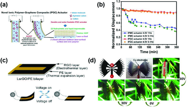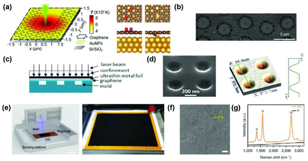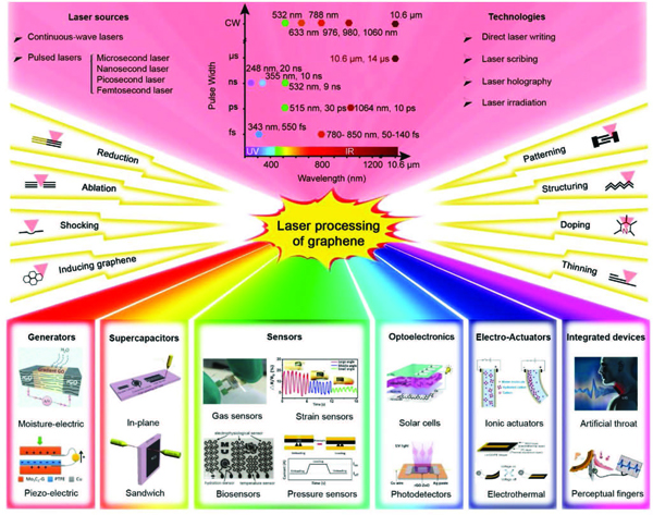 石墨烯凭借出色的柔韧性、透明性、导电性和机械强度,已经成为制备柔性电子器件的多功能材料。在过去的十年中,多种激光技术用于石墨烯的加工,如:激光还原氧化石墨烯(LRGO),石墨烯的图案化、多级结构化、杂原子掺杂、减层、刻蚀、冲击等,以及激光处理聚酰亚胺(PI)制备石墨烯(LIG)。石墨烯广泛应用于多种电子器件制备,如发电机、超级电容器、光电器件、传感器和驱动器等。