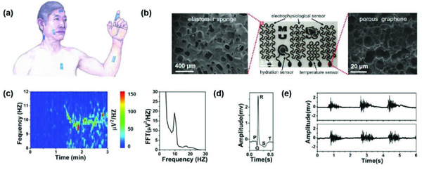 c-e)生物传感器记录的c)α节律,d)ECG,e)EMG信号。