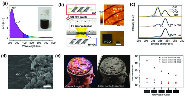 b)激光光化学还原GO的示意图,AFM图像,实物照片(比例尺:1 mm)。