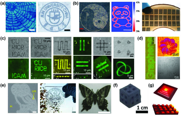 b)基于LRGO的太极(比例尺:50µm)、熊猫(比例尺:10µm)和石墨烯电路图案。