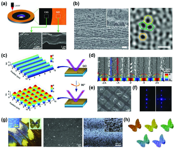 f)1维和2维光栅结构LRGO用于光衍射演示。