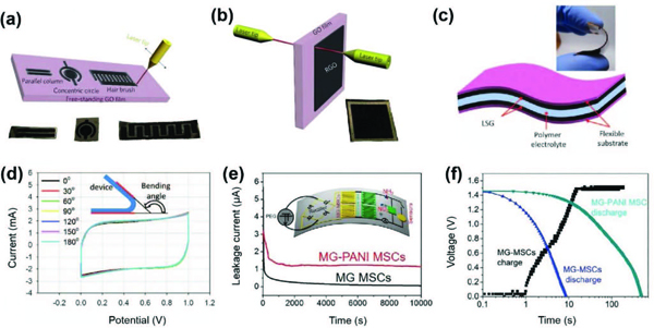 c)柔性LRGO超级电容器器件结构示意图与实物照片。