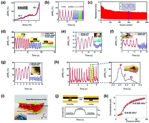i-k)LRGO压力传感器的i)器件结构,j)传感机制,k)电导与压力关系。