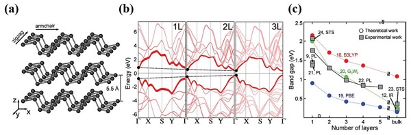 b)从HSE06混合功能计算中提取的少层磷烷系统的电子能带结构