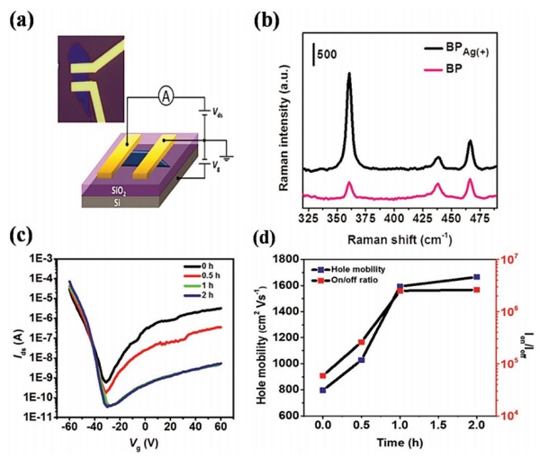 c)在Ag+改性0,0.5,1和2小时后,在室温下从BP-FET获得的电流至栅极电压曲线
