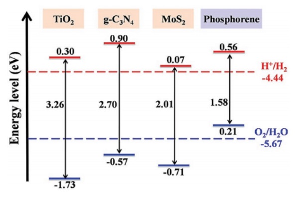 Figure 13. 用于水分解的光催化剂的TiO2,g-C3N4,MoS2和磷烯的带边缘位置的示意图