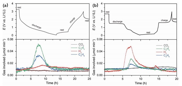Figure 5.NbO2/碳和商用LTO电极初始放电/充电循环的DEMS