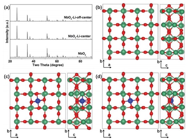(b)优化的原始NbO2和Li在Li-NbO2处的位置的晶体结构模型,涉及(c)Li-中心和(d)Li-偏心位置