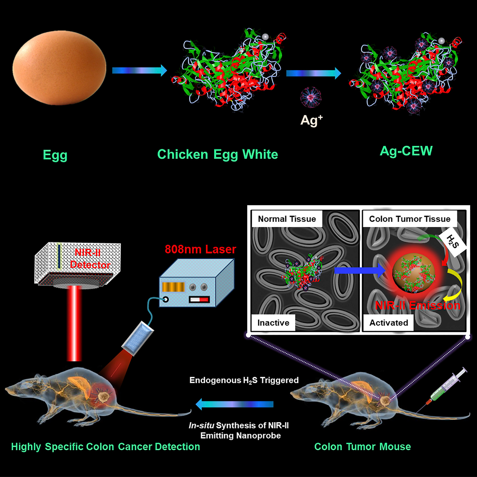 近日,湖南师范大学曾松军教授和香港理工大学郝建华教授团队利用银–鸡蛋白螯合物(Ag-CEW)和内源性H2S原位硫化生成具有近红外二区(NIR-II)发射的硫化银量子点的原理,开发了一种内源性H2S激活的结肠癌智能诊断纳米探针,用于结肠癌的高灵敏性、高特异性诊断。这为实现结肠癌的早期非侵入性高灵敏诊断迈出了重要一步。该成果以题为”Endogenous H2S-Triggered In Situ Synthesis of NIR-II-Emitting Nanoprobe for In Vivo Intelligently Lighting Up Colorectal Cancer“发表在Cell出版社下的iScience期刊上。