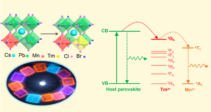 近日,西南交通大学杨维清教授团队通过在全无机钙钛矿(CsPbBr2.2Cl0.8)量子点中引入Mn2+和稀土元素铥(Tm3+),通过Tm3+的1G4的能级来构建一个在钙钛矿和Mn2+之间的梯度能级。该梯度能级的构建促进激子从钙钛矿到Mn2+的转移,从而实现在低的Mn2+掺杂浓度下,通过控制Tm3+的量来大范围地对发光颜色调控(12400到1800K,绿到橙红)。经过精确调节,最终获得量子产率为54%,色坐标为(0.34,0.33)的本征纯白光发。此外,基于此单组分白光荧光粉和紫光LED的白光发光器件的显色指数高达91,非常接近太阳白光。该工作为研究高效的本征白光发射钙钛矿并应用于未来固态照明提供了新思路。该工作以题为“Constructing Gradient Energy Levels to Promote Exciton Energy Transfer for Photoluminescence Controllability of All-Inorganic Perovskites and Application in Single-Component WLEDs”发表在《Chemistry of Materials》上,硕士研究生骆超为第一作者,该项工作得到了国家自然科学基金、四川省HTH官网地址 厅国际合作项目以及中央高校基础研究经费等项目的支持。