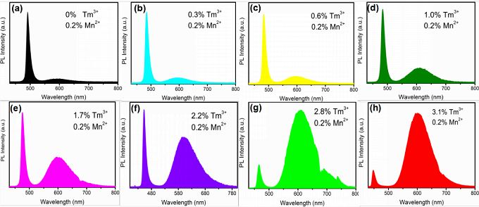 (a-h)基于此梯度能级的构建,即使Mn2+浓度固定在较低值,也可以通过控制Tm3+的量来实现对Mn2+峰强度的调控。