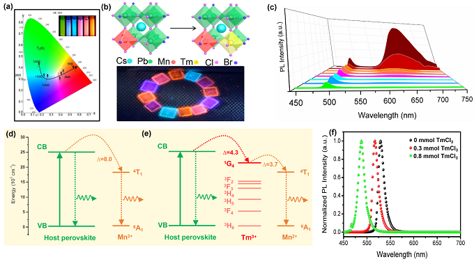 (a)随着Mn2+峰强度变化对应色坐标及胶状溶液在紫外灯下颜色的变化(b)掺杂原理及薄膜在紫外灯下的颜色变化(c)PL发光峰(d-e)梯度能级构建前后能级示意图(f)只掺杂Tm3+发现没有发射峰