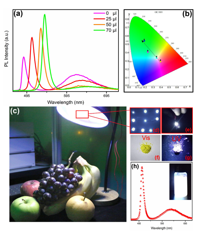 (a-b)引入HBr进一步精确调节发光颜色和色坐标 (c)基于此白光钙钛矿量子点的台灯 (d-e)基于此白光钙钛矿量子点的单个发光器件 (f-g)在可见光和紫外光下的白光荧光粉 (h)本征白光发射对应光谱和在紫外灯下的白光溶液