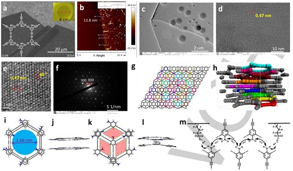 (h)多层NH2-GDY的堆积图,不同颜色显示质子的传输通道;