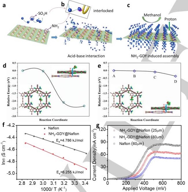 如今,直接甲醇燃料电池(DMFC)以其便携性、安全性、高能量密度和可再生性等优点而被广泛关注。虽然Nafion膜是质子交换膜(PEM)的标杆,但是其高质子传导性伴随着严重的甲醇渗透,进而降低了甲醇的利用效率,并使阴极催化剂中毒。多孔二维材料(石墨烯,h-BN)具有良好的尺寸稳定性,可以用来降低甲醇的渗透。但是,大面积二维材料制备和可控穿孔技术方面目前还有很多的问题需要解决,难以获得大面积可以用于DMFC的多孔二维材料。近年来,二维原子晶体石墨炔(GDY)由于在选择性纳米孔道、尺寸稳定性和制备方法等方面具有独特的优势,其已经在储能、催化和光电子领域展现出强大的潜力。将石墨炔与Nafion有效结合,两者在质子传导性和甲醇抑制等方面优势互补,可以得到理想的DMFC膜。