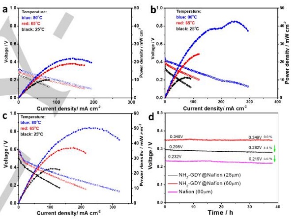 (a-c)具有Nafion、NH2-GDY@Nafion-25和NH2-GDY@Nafion-60的DMFC的极化曲线和功率密度;