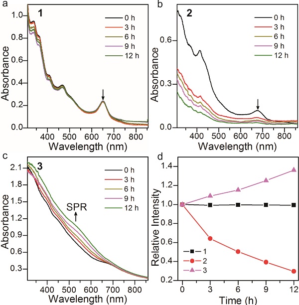 a-c)在80℃加热的情况下对NHC, 膦和硫醇保护的Au25的紫外-可见光谱追踪