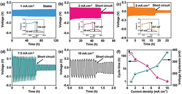 (a-e)在1-10 mA cm-2的不同面电流密度下记录的电压-时间曲线,(a-c)中的插图对应于短路之前的最后一个周期的放大曲线,其中标记了电压滞后和放电平台的极化电位;