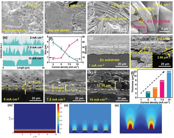 (m-o)沿着具有不同枝晶形成条件的电极2D表面的Zn离子扩散和分布的模拟:平坦表面(m),4个小晶种(n)和2个大晶种(o)。