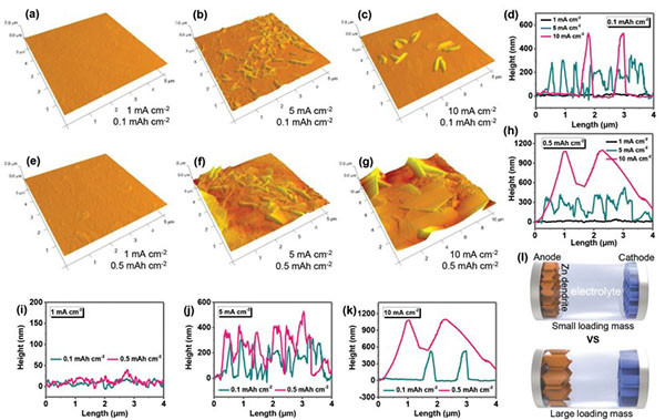 (e-g)Zn电极单次充电后(电流密度:1,5,10 mA cm-2,容量:0.5mAh cm-2),使用AFM图像研究Zn枝晶在各种电流密度下的生长行为;