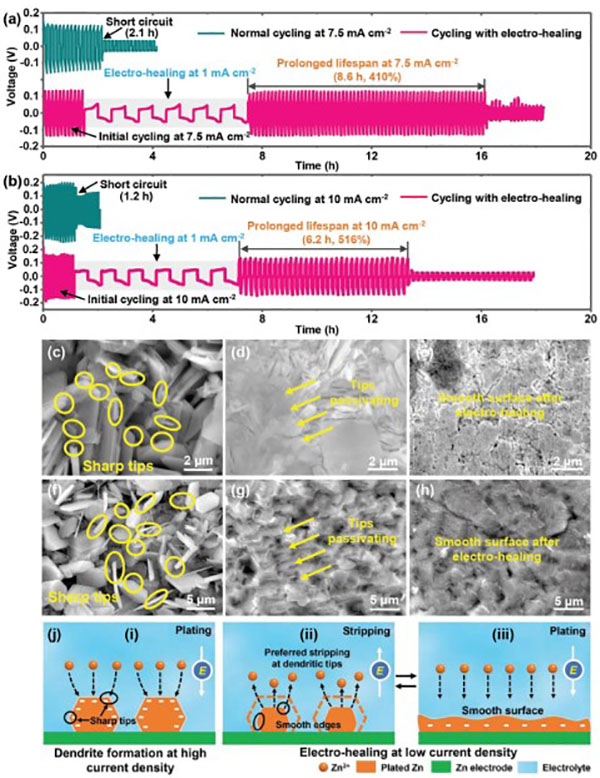 (j)电愈合过程的示意图,其中枝晶的尖锐尖端被钝化成光滑的边缘并最终产生光滑的电极表面。