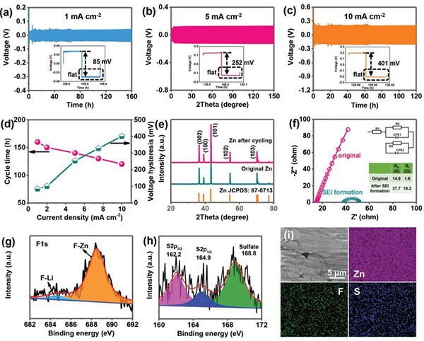 (f-h)Zn电极的循环后SEM图像:在10mA cm-2下循环1小时(f),在1mA cm-2下循环3小时(g)和在1 mA cm-2下循环6小时(h);