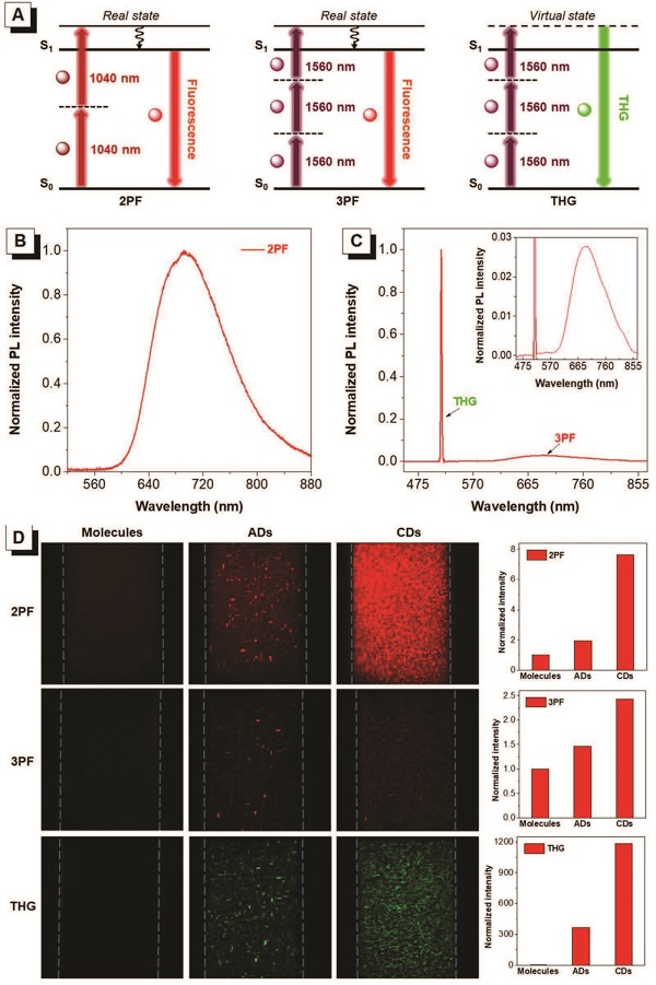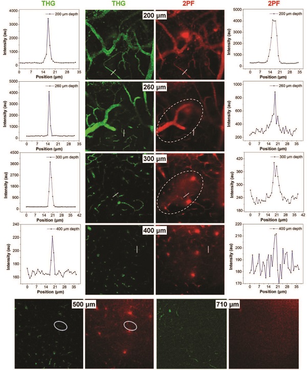 非线性光学成像由于其独特的深度光学切片能力,高空间分辨率和对生物样本的三维重建能力,已成为生物成像研究领域的热点方向。此前的非线性光学成像研究工作主要集中在双光子荧光成像。在双光子激发荧光过程中,双光子荧光强度与激发光功率的二次方成正比。与之相比,三光子荧光和三次谐波产生的强度均与激发光的三次方成正比。因此,三光子荧光成像和三次谐波成像相比于双光子荧光成像具有更高的空间分辨率;此外,由于三光子荧光与三次谐波产生所用的激发波长相较于双光子更长,因此具有更大的成像深度。另一方面,尽管三光子荧光和三次谐波产生具有相同的激发光功率依赖性,但三次谐波产生属于三阶非线性光学现象,而三光子荧光属于五阶非线性光学过程。这表明三次谐波产生的激发阈值比三光子荧光低得多。这些特征使三次谐波成像在深层组织和高分辨生物成像领域具有重要的应用前景。