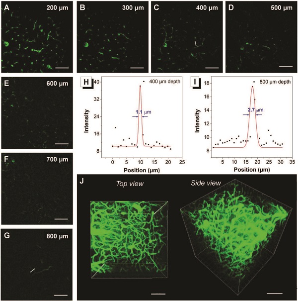 近日,香港HTH官网地址 大学唐本忠院士与浙江大学钱骏教授联合报道了一种基于具有明亮近红外发射的聚集诱导发光(AIE)分子(DCCN)制备有机纳米晶的简单方法。在纳米颗粒中观察到了DCCN的聚集诱导非线性光学效应,包括双光子荧光、三光子荧光和三次谐波产生。成功地将DCCN纳米晶应用于1040 nm近红外光激发的双光子荧光显微成像和1560 nm近红外光激发的三次谐波显微成像,重建了小鼠脑血管的三维血管系统。实验结果显示,三次谐波成像具有比双光子荧光成像和三光子荧光成像更高的的空间分辨率和亮度。三次谐波成像的最大成像深度为800 μm,并且,在800 μm深度的毛细血管仍然清晰可见,可以实现2.7 μm的超高分辨率。这一研究成果大大拓展了AIE材料在非线性光学成像领域的应用潜力。该成果近日以题为“Aggregation‐Induced Nonlinear Optical Effects of AIEgen Nanocrystals for Ultradeep In Vivo Bioimaging”发表在知名期刊Adv. Mater.上。
