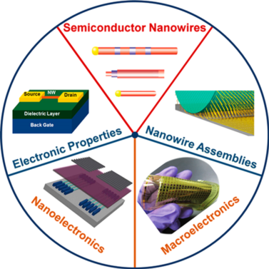 加州大学的Chuancheng Jia, Zhaoyang Lin总结了在过去的二十年中有关探索具有组装功能的半导体纳米线在纳米级电子学和宏观电子学上的研究成果。半导体纳米线是自下而上组装功能性电子和光电设备的纳米级构建块之一。文章首先简要概述各种半导体纳米线和纳米线异质结构的合成控制,及精确控制其物理尺寸,化学成分,异质结构界面和电子特性的方法,从而为纳米线电子学提供了材料基础。然后,总结了一系列组装策略,这些策略是为制备具有可控取向和密度纳米线阵列而开发的,对于利用半导体纳米线构建越来越复杂的电子设备和电路至关重要。接下来,结合纳米线可调控电子特性和可控的组装方法,概述了一系列由纳米线构件组装而成的纳米级器件和集成电路,以及用于高性能大面积柔性的溶液可处理纳米线薄膜晶体管的独特设计。