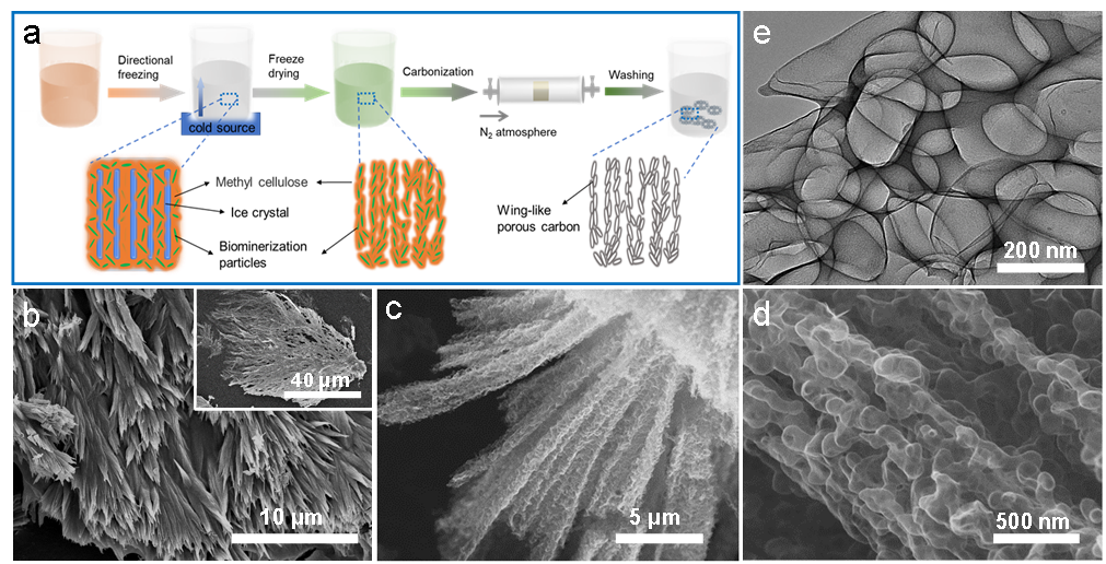 今日,中国海洋大学柳伟教授课题组用碳酸氢钠和甲基纤维素合成了新型的有机-无机矿化前驱体。在合成过程中采用冷冻方法加快矿化分子的形成,从而作为一种改进的BM方法来制备纳米材料。在此基础上,通过对矿化分子的碳化和无机盐的去除,得到了由多个相互连接的空心碳囊泡组装而成的形似羽翼状多孔碳纳米片(WPCSs)。结果表明,WPCSs具有较好的钾离子存储性能。作为一个新的领域,相信在未来探索先进功能材料的道路上,冻结条件下的生物矿化将给我们带来更多的惊喜。
