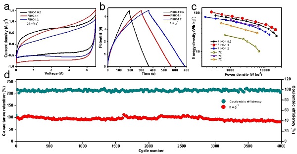 图六:组装的WPCS//WPCS钾离子混合电容器的电化学性能测试。