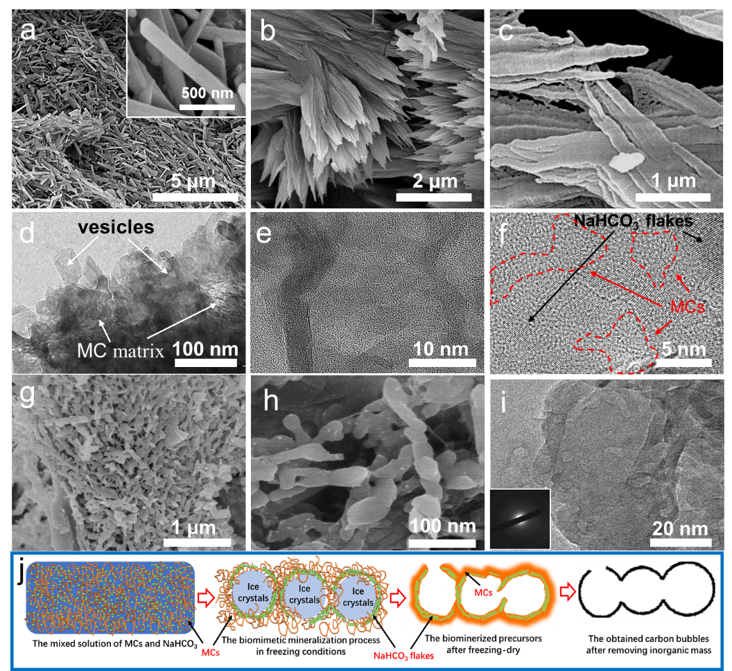 图二:(a)冷冻条件下制备的碳酸氢钠纳米晶的SEM图片。WPCS前驱体的(b-c)SEM和(d-f)图片。(g-i)WPCS前驱体碳化后未除去碳酸氢钠纳米晶的SEM和TEM图片。(j) 碳酸氢钠纳米晶在纤维素中诱导矿化示意图。
