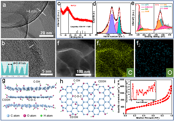 图三:(a-b)WPCS的高分辨TEM图片。(c-e)WPCS的XRD,Raman,XPS分析。(f)TEM mapping中碳和氧元素的分布。(g-h)WPCS石墨结构示意图。(i)WPCS的氮气吸脱附曲线和孔径分布。