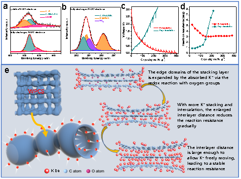 图五:钾离子在WPCS电极中的扩散过程分析。(a-b)WPCS电极在初始状态和完全放电状态下的XPS元素分析。(c-d)WPCS电极材料的GITT测试和内阻分析。(e)WPCS电极中钾离子嵌入过程示意图。