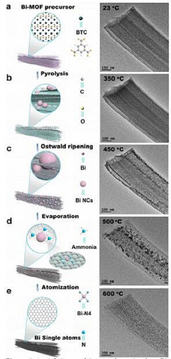 (a-e) Bi-MOF转化成Bi单原子的过程的示意图以及不同温度下双氰胺辅助热解的Bi-MOF的TEM图