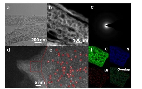 Bi SAs/NC的(a) TEM图、(b) STEM图、(c) SAED图、(d, e)放大的HAADF-STEM图和(f) EDS元素分析的结果。
