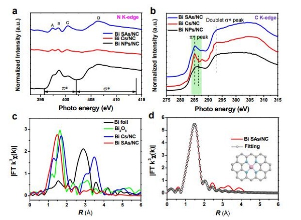 (a)Bi SAs/NC、Bi Cs/NC和Bi NPs/NC的N K-edge XANES图