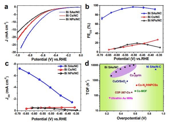 (d) Bi SAs/NC和大部分最新的CO2还原成CO的反应的催化剂的TOF的对比
