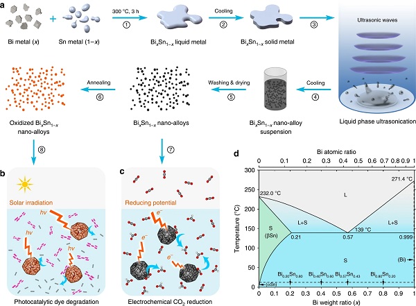 (b-c)Bi-Sn纳米合金用作电化学还原CO2的催化剂和退火的Bi-Sn纳米合金用作有机模型染料的光催化降解催化剂;