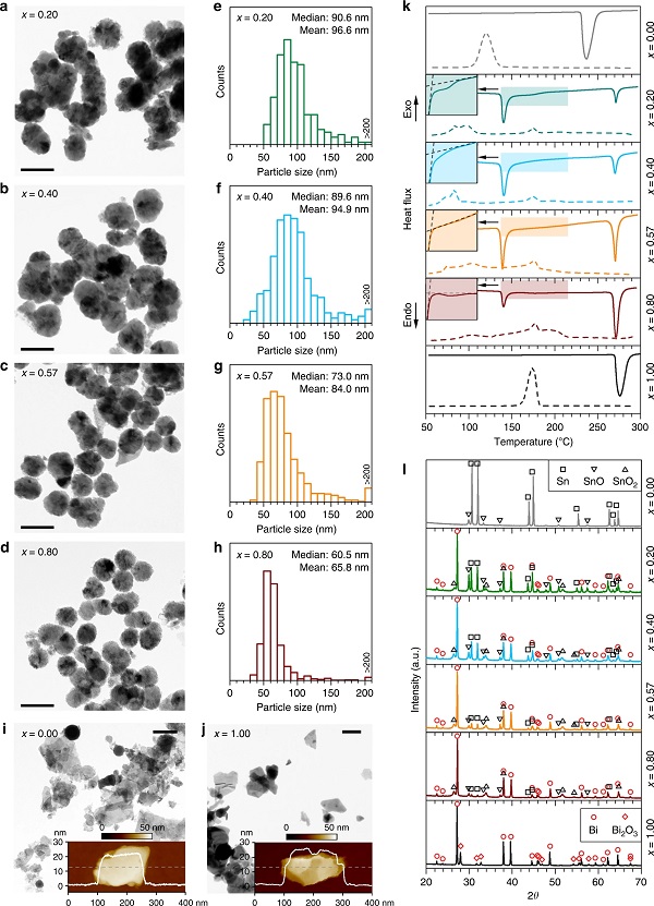 (a-d)通过液相超声制备的不同组成Bi-Sn块状纳米合金的TEM图;