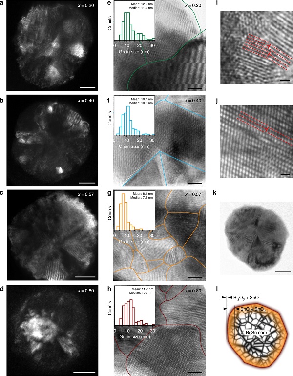 (a-d)不同Bi-Sn纳米合金样品中单个颗粒的DF-TEM图像;