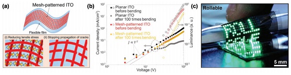 b)在弯曲100次前后,具有平面或网状ITO电极器件的JVL特性
