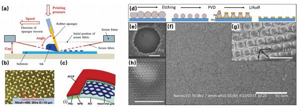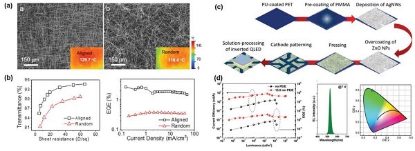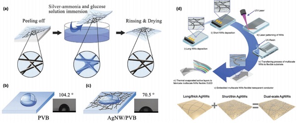 d)双尺度AgNW网络透明电极制备工艺及其在柔性OLED中的应用示意图