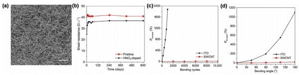 d)SWCNT和商用ITO-PET TCF的方阻与弯曲角度的变化