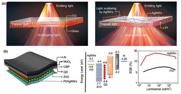 a)在玻璃/ ITO和PI/AgNW基板上的光取出示意图
