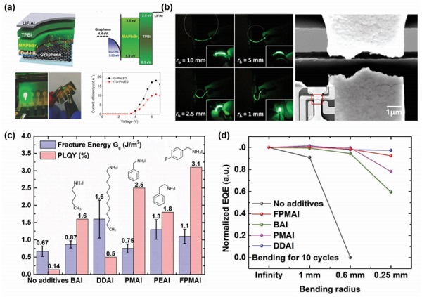cd)钙钛矿薄膜的断裂能和光致发光量子效率,以及不同添加剂flex-PeLED的EQE变化